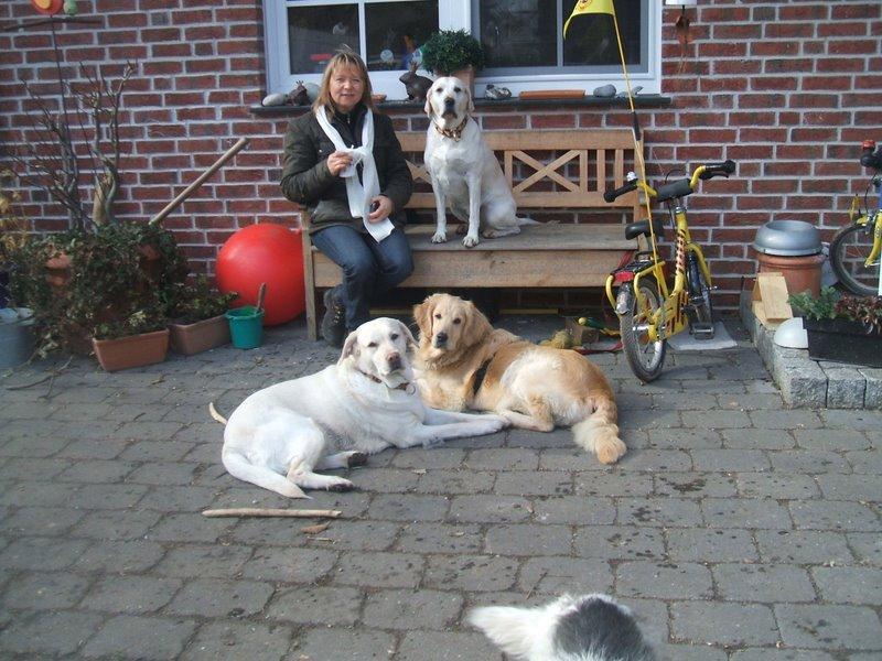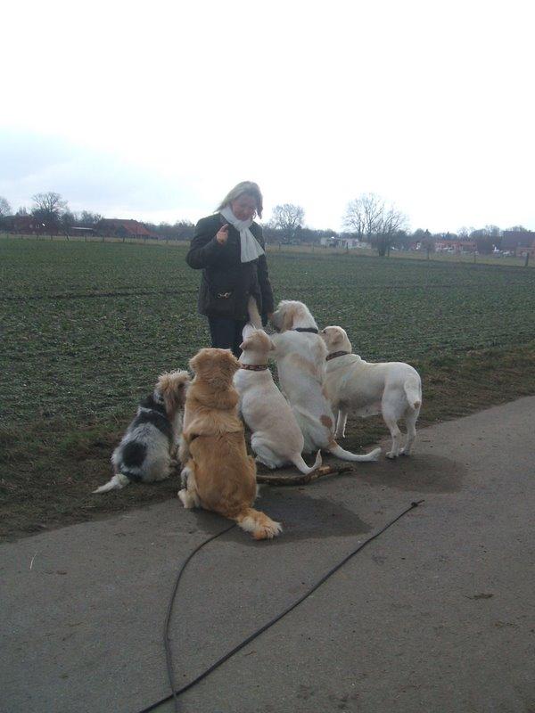 Heute waren Sally, Resi und Amber zu Besuch und wir haben einen schönen Spaziergang gemacht. Die Sonne schien und zwischendurch hat es geschneit. Ganz komisches Wetter haben wir hier. Und dann haben wir Formationssitzen gemacht und alle haben einen Keks von Regina bekommen.