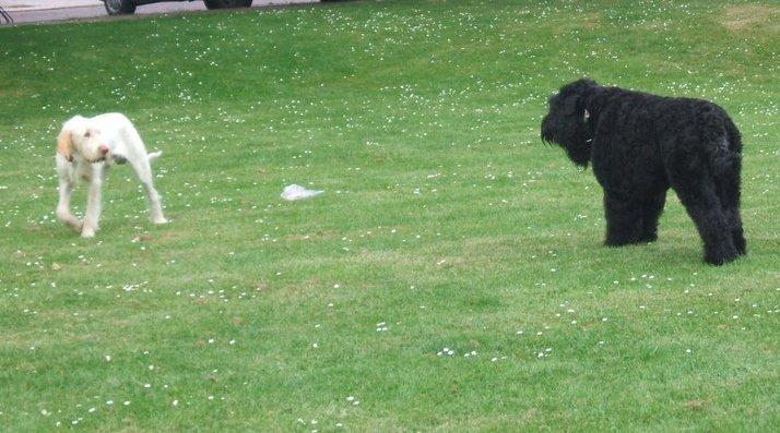 Und dann habe ich King Kong kennen gelernt! Mutig wie ich bin, habe ich eine Runde mit ihm gespielt. Er heißt Gordian und kommt aus der gleichen Zucht, wie mein Janosch!