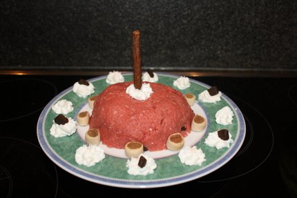 Nein, das ist kein Mett-Igel mit Sahne. Es ist eine Maître-Müller-Kluck-Torte mit Rinderhack, Platinum und Quark.