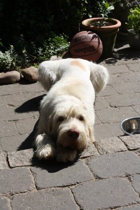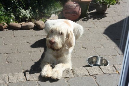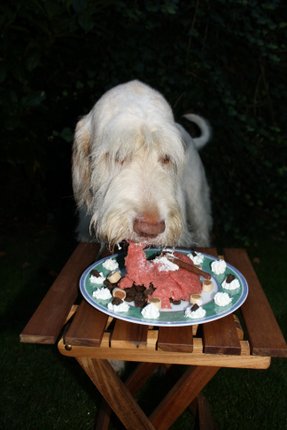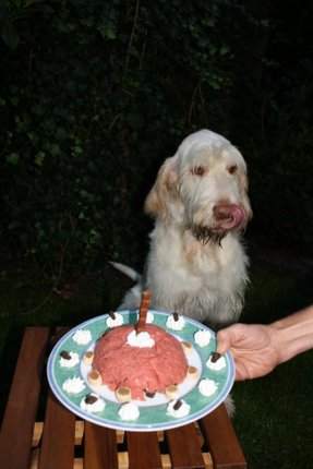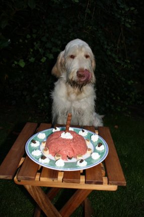 DAS IST SIE ! ! ! Oder besser gesagt, das WAR sie - meine Geburtstagstorte. Den ganzen Tag habe ich mich gefragt, ob da wohl noch was kommt, denn es gab heute nur das übliche Frühstück und mittags mal wieder gar nix. Abends musste ich dann auch noch mit Andreas Joggen gehen, was mir nicht sonderlich viel Spaß macht. Aber er ist mein Kumpel und einer muss ja auf ihn aufpassen, falls er unterwegs mal schlapp macht... Naja, jedenfalls habe ich nach dem Laufen eine Runde cool down im Sessel vorm Haus gemacht und plötzlich ging die Tür auf und meine Leute standen mit dieser Geburtstagstorte vor mir! Ihr könnte Euch nicht vorstellen, wie sehr ich mich darüber gefreut habe! Und ich durfte sie ganz alleine auffuttern! Die 3 Wilden haben ganz schön lange Gesichter gemacht hinter der Haustür.