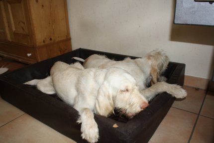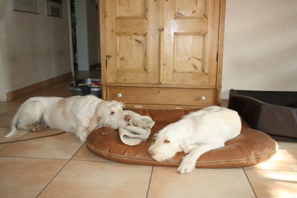 Franzi wollte sich partout nicht auf die Fliesen legen. Sie hat sich immer wieder auf den Teppich im Ring geschlichen. Verwöhntes Luder kann ich nur sagen.