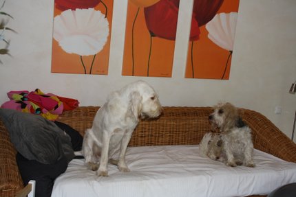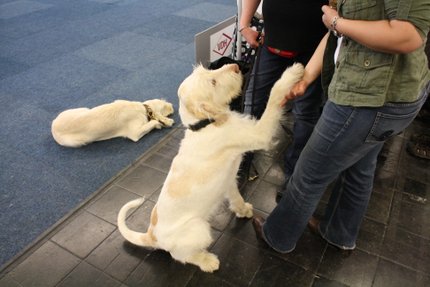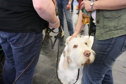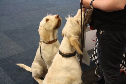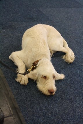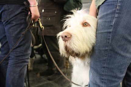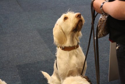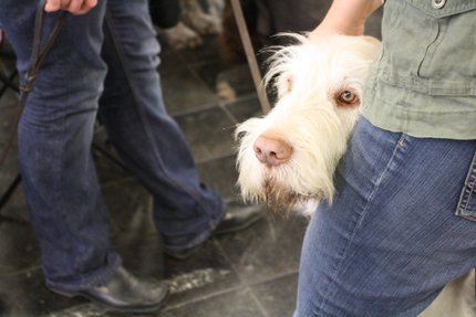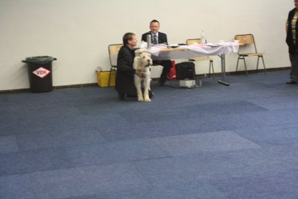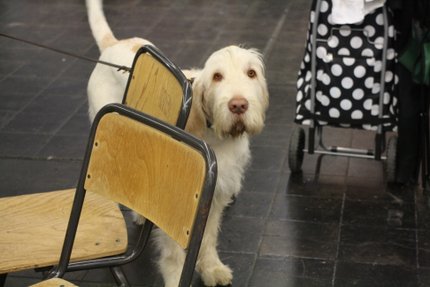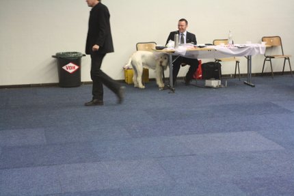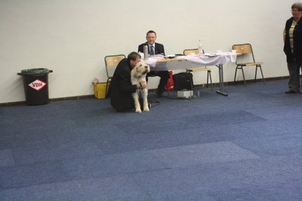 Heute mussten wir alle ganz früh aufstehen und dann sind wir nach Dortmund gefahren. Ich dachte schon, dass ich da wieder sinnlos im Kreis laufen muss, aber dann kam es ganz anders. Nachdem wir ein bisschen rumgestanden und die vielen anderen Hunde beobachtet haben, musste ich mit Caro in den Ring gehen und dort wurde ich erstmal von einem sehr netten Herrn im Anzug begrüßt. Der war mir gleich sympathisch, also habe ich mich auf seine Füße gestellt und von ihm abtasten lassen. Was er da gesucht hat, weiß ich nicht, aber es hat nur stellenweise gekitzelt, ansonsten war es aber ganz ok. Ins Maul hat er mir auch geschaut - ich vermute, wer wollte gucken, ob ich schon gefrühstückt hatte. Dann musste ich durch einen Haufen Leute traben und ein fremder Hund kam mir auch noch entgegen. Ich habe das alles so hingenommen und keine Fragen gestellt. Dann hat Caro mich am Tisch festgebunden und ist weggegangen. Das kam mir dann aber doch komisch vor. Ich bin dann zu dem zweiten Herren im Anzug, der hinter dem Tisch saß, und habe mit ihm zusammen abgewartet, bis Caro wieder kam. Dann wurden noch Hände geschüttelt, Ohren gekrault und damit war meine Arbeit in Dortmund getan und Caro war zufrieden mit mir. Ich habe nun die uneingeschränkte Zuchtzulassung und bin schon sehr gespannt, was ich davon habe.