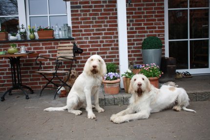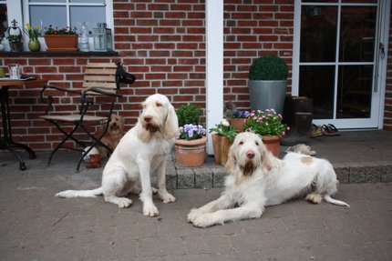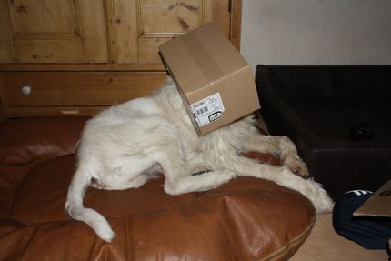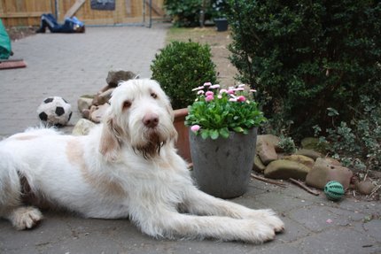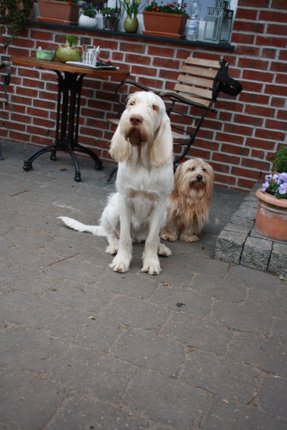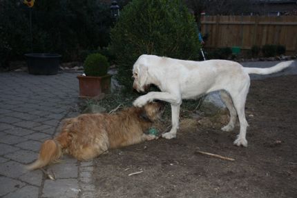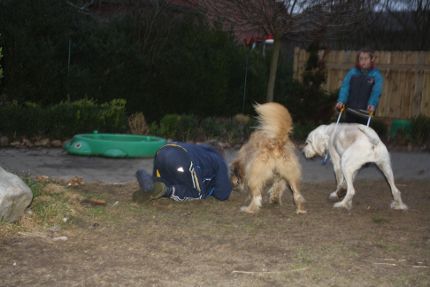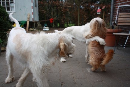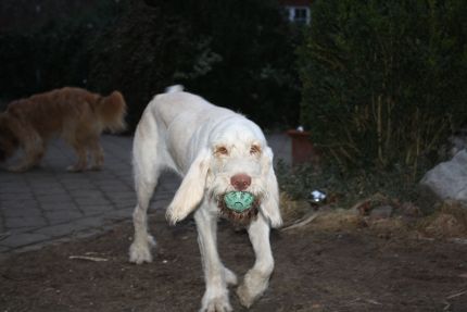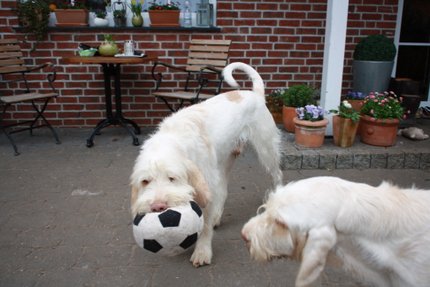 Heute hatten wir Besuch von Pelusa. Franzi hat mit ihr Ball gespielt und jedes Mal, wenn sie ihr auf den Kopf getippt hat, hat Pelusa den Ball ausgespuckt. Plopp...