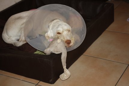 Sie tut mir echt leid. Sie muss jetzt eine Woche mit diesem Trichter rumlaufen. Aber die Stofftiere kann sie damit genauso gut wie sonst auch durch die Gegend schleppen.