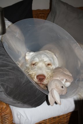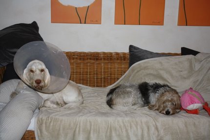 Gestern musste Franzi unter Vollnarkose genäht werden. Die Klammern haben nicht gehalten. Jetzt hat sie einen Abnäher unterm Arm.