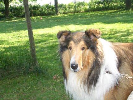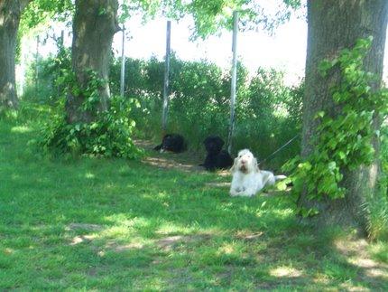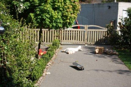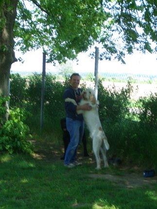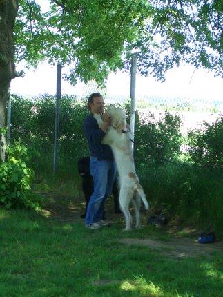 Heute Abend wurde gegrillt. Und obwohl ich mich heute so ins Zeug gelegt habe und die Prüfung bestanden habe, durfte ich nix Gegrilltes essen! Ich musste mir mein Futter mühselig aus dem Kegel-Kong rausarbeiten. Und dann haben sie sich auch noch beschwert, weil ich mich dabei so dreckig gemacht habe. Aber unter den Büschen kriege ich das Ding eben am schnellsten leer... Naja, dafür war Andreas noch mit mir am Teich und ich habe noch ein kleines Bad genommen. Da war der Abend gerettet.