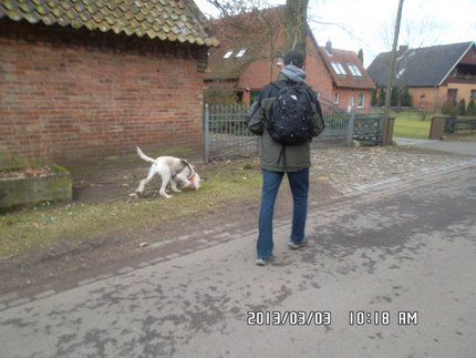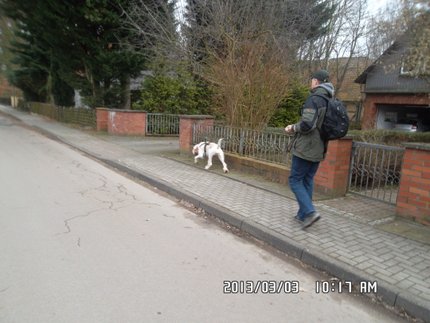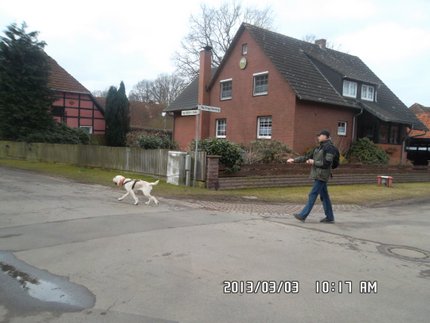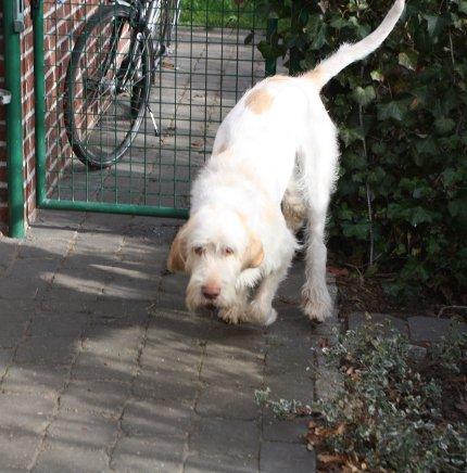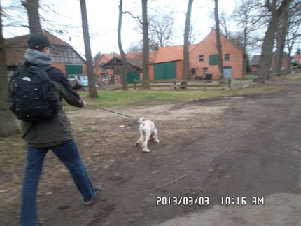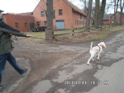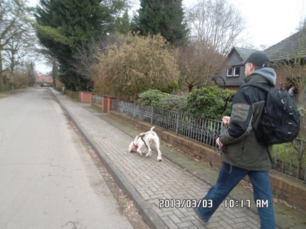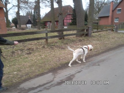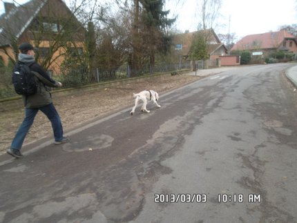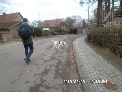 Heute hatten wir einen schönen Tag! Wir sind zum Trailen in einen Ort gefahren, den wir noch gar nicht kannten. Sie haben gesagt, dass ich meine Sache sehr gut gemacht habe. Aber ich fürchte, Franzi war besser. Sie hat wieder den Turbo eingelegt und ruck zuck waren sie wieder am Auto. Ich hatte schon mit einer längeren Wartezeit gerechnet und vorsorglich ein bisschen rumgejammert, als sie an der Reihe war, aber die kennen ja keine Gnade, sie lassen mich einfach allein zurück.