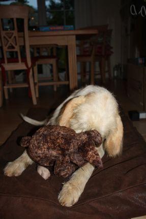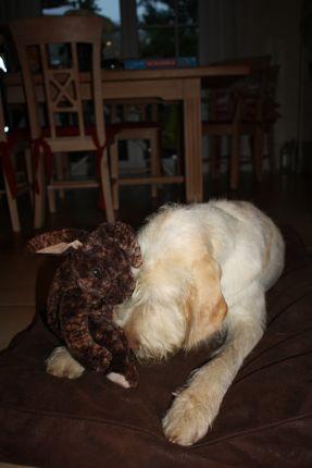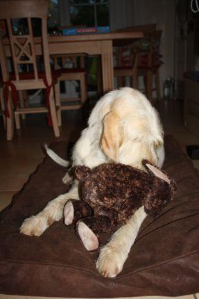 Und nach dem leckeren Essen habe ich ein Geschenk bekommen. Ich hatte mir ein Kaninschen gewünscht. Und das hat Caro wohl falsch verstanden. Ich wollte ein echtes Kaninschen und dann bekomme ich dieses Stofftier! Und es ist ja nicht mal ein Kaninschen, es ist ein Hase! Das sieht man doch an der Ohrenlänge!