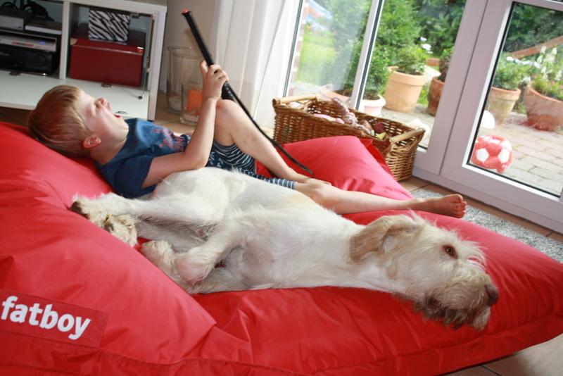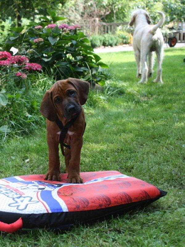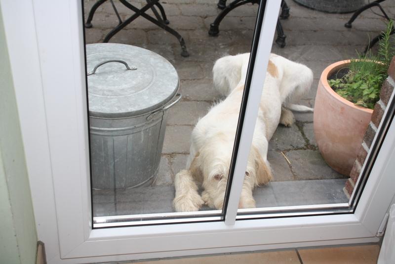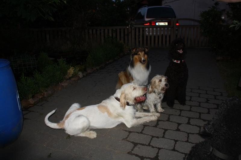 Lotte dachte wohl, der zieht jetzt bei uns ein. Nachdem sie eine Stunde nicht aus ihrem Körbchen raus gekommen ist, habe ich ihr erklärt, dass wir nur heute auf ihn aufpassen müssen und er nachmittags wieder abgeholt wird. Dann war sie beruhigt und ist mit uns im Garten geblieben. Sie hat den kleinen Kerl aber konsequent ignoriert.