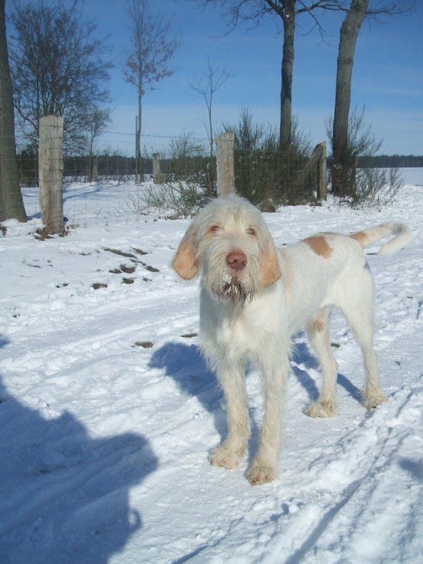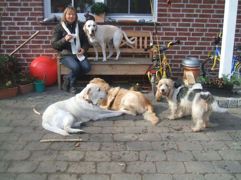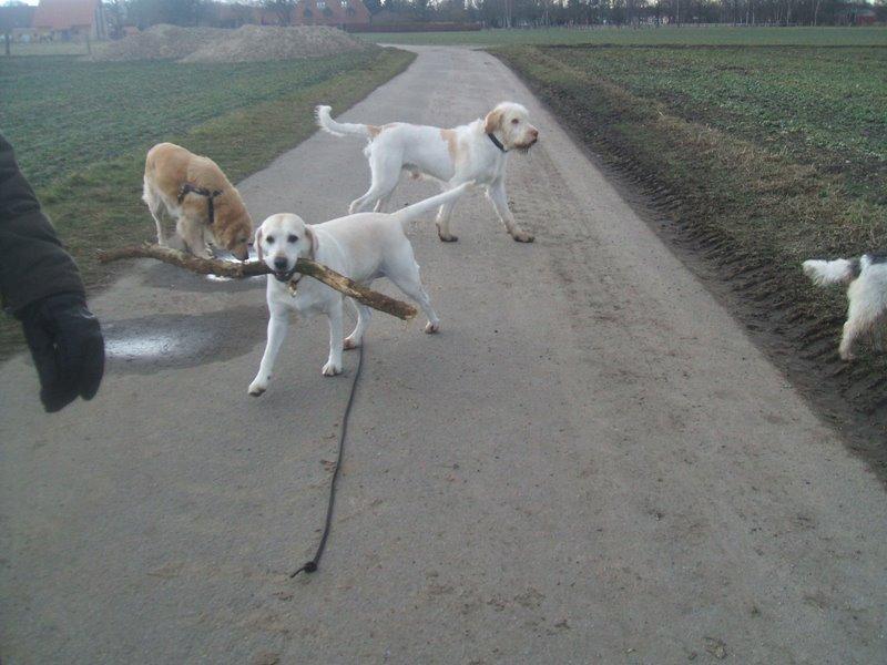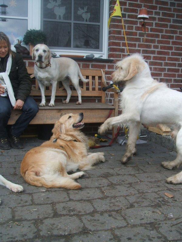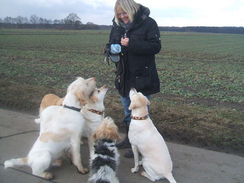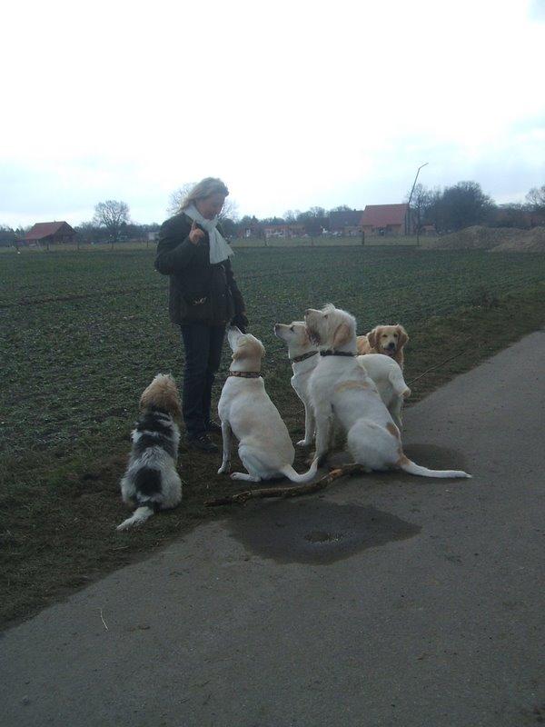 Heute waren Sally, Resi und Amber zu Besuch und wir haben einen schönen Spaziergang gemacht. Die Sonne schien und zwischendurch hat es geschneit. Ganz komisches Wetter haben wir hier. Und dann haben wir Formationssitzen gemacht und alle haben einen Keks von Regina bekommen.