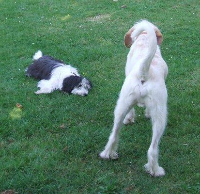 Und dann habe ich King Kong kennen gelernt! Mutig wie ich bin, habe ich eine Runde mit ihm gespielt. Er heißt Gordian und kommt aus der gleichen Zucht, wie mein Janosch!